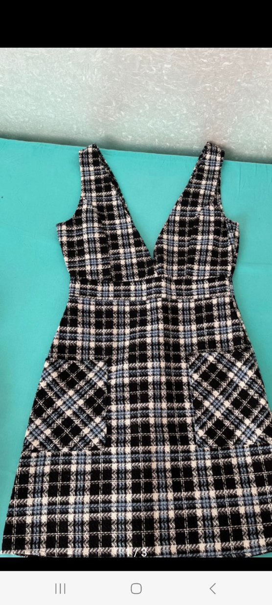 V yaka, kolsuz, ekose desenli, düğmeli ve cepli midi boy sıkı kesim elbise. Paris sokak modası tarzında, günlük kullanım için uygun.