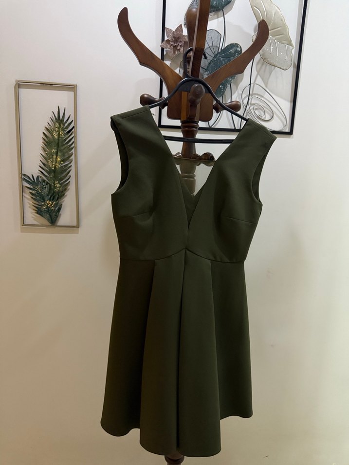 V yaka ve kolsuz, pliseli detaylara sahip haki renk midi elbise, modern klasik tarzda günlük kullanıma uygun.