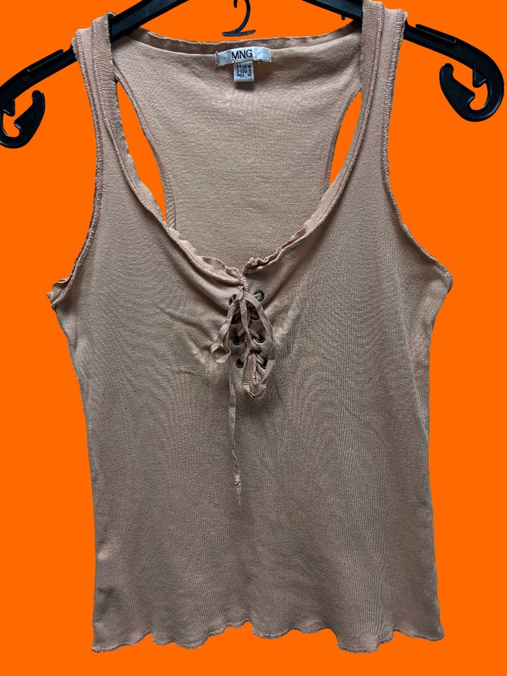 Bej renkli, V yakalı ve dantel detaylı kolsuz kadın atlet, yumuşak keten kumaştan üretilmiş, rahat sokak stili için uygundur.