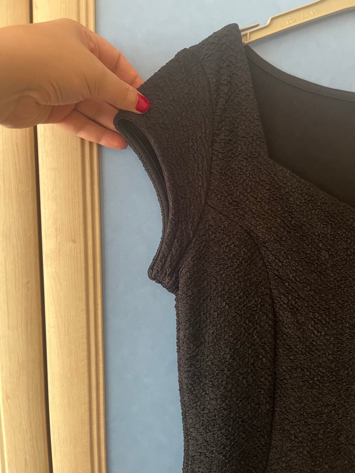 Düğmeli V yakalı, kolsuz, midi uzunlukta, siyah renkli, yumuşak sentetik kumaştan yapılmış, kadın elbise. Rahat tarzda, bir kere giyildi mezuniyette