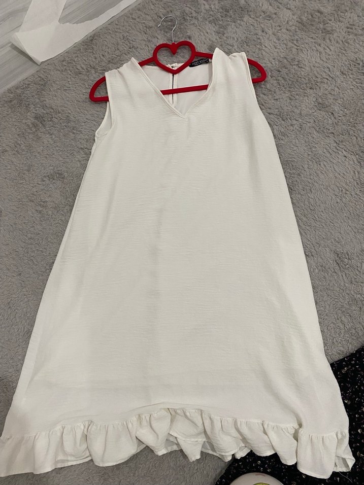 V yaka ve fırfırlı etek ucu ile kolsuz midi elbise. Yumuşak sentetik kumaştan, bol kesim, günlük bohem tarz için uygun.