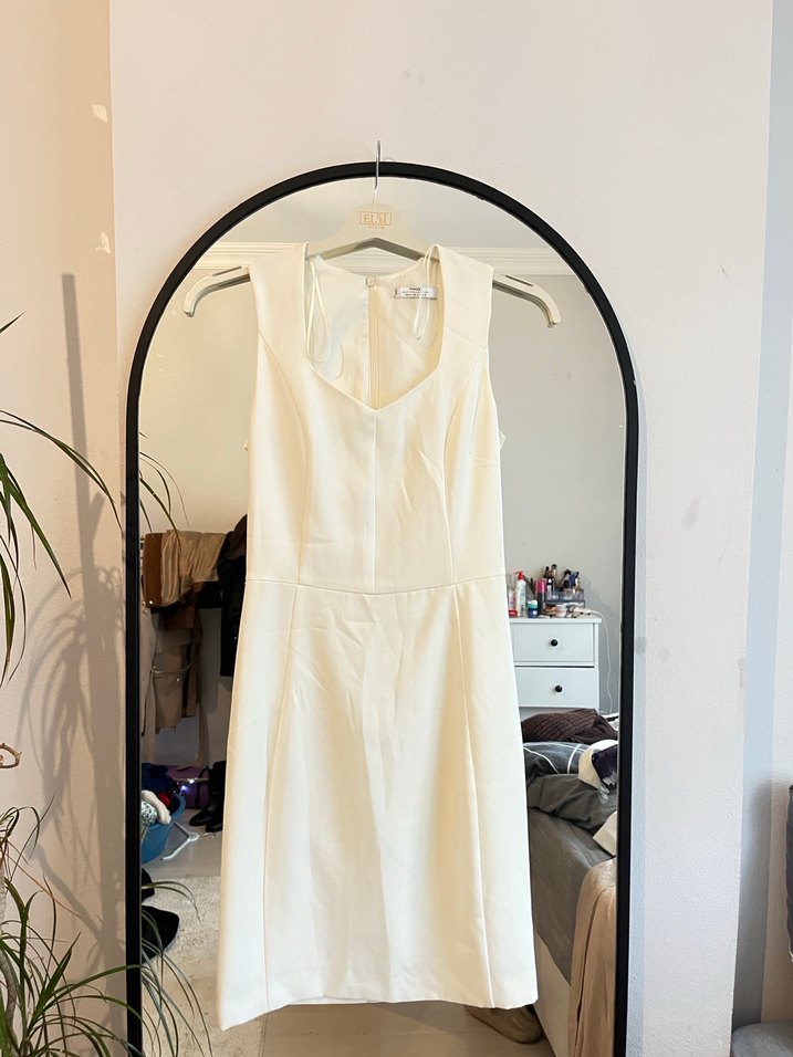 V yaka ve kolsuz, ince kesim beyaz midi düğün elbisesi. Modern klasik tarzı ve Paris şıklığını yansıtır. Ofis kullanımı için uygundur. Mango m beden