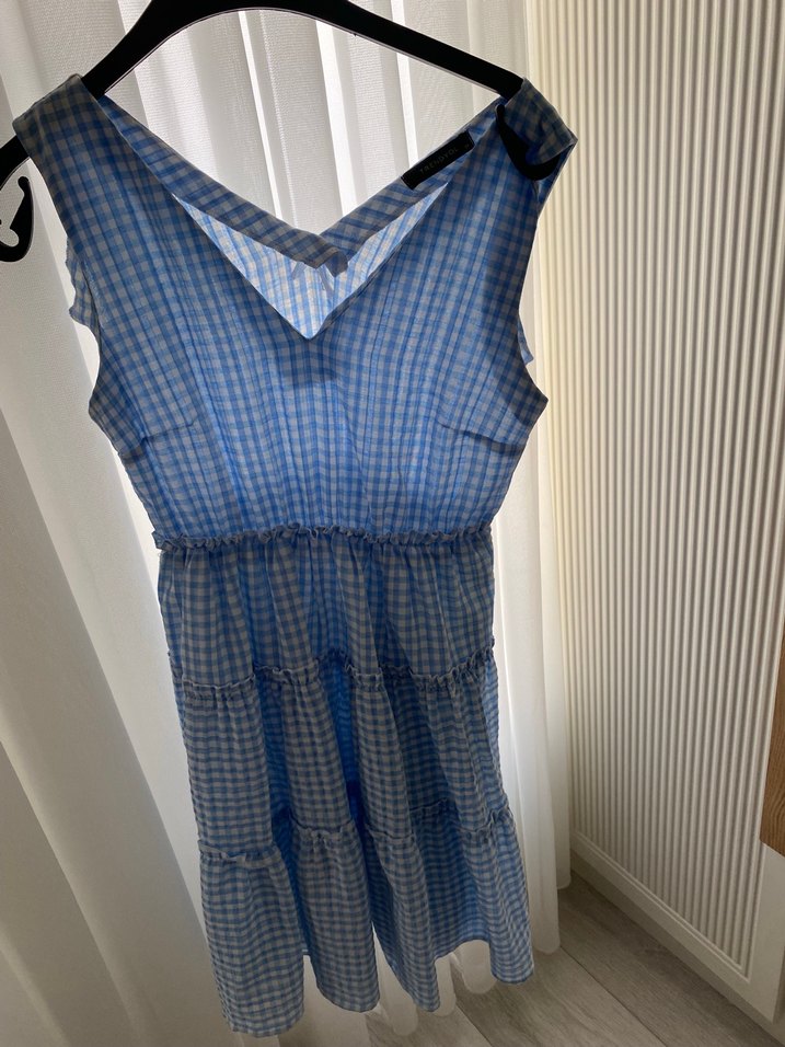 V yaka, kolsuz midi elbise, yumuşak sentetik kumaştan. Gevşek kesim ve mavi-gri tonlarda hafif batik desenli, fırfır detaylıdır. Rahat kullanım için uygundur.