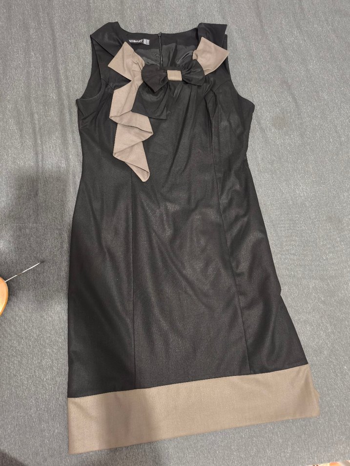 V yakalı, kolsuz, siyah midi elbise, vücuda oturan kesim ve gri fırfır detaylı, şık ofis tarzı için uygun.