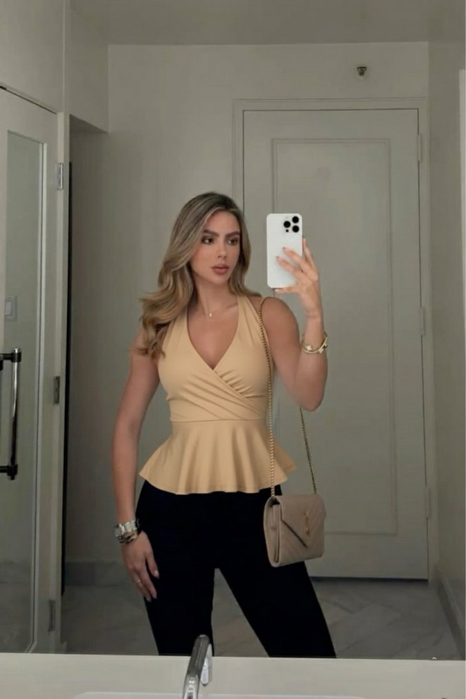 Bej renkli, malzemeden yapılmış, V yaka ve kolsuz, baskılı desenli, kısa ve vücuda oturan bluz, rahat ve şık bir günlük kullanım sunar.
