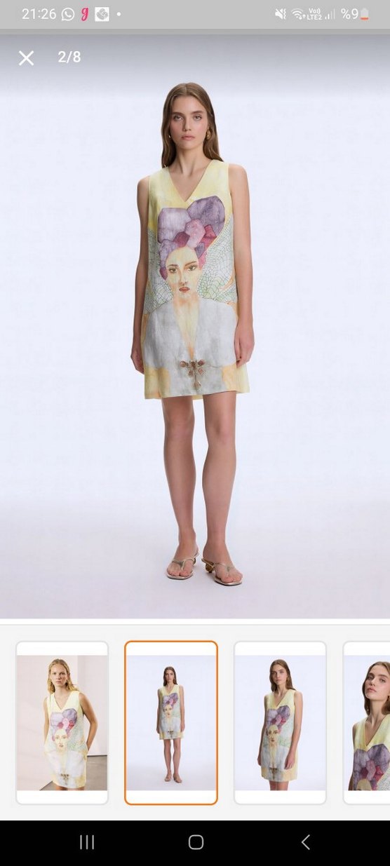 Kolsuz, bol kesim ve drapeli tasarıma sahip bu mini elbise, satenimsi kumafta pastel tonlarda batik desen içerir.