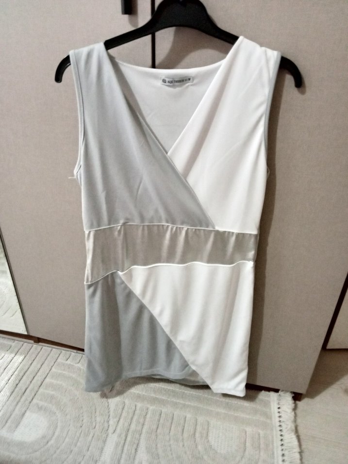 V yaka, kolsuz elbise drapeli ve fitted kesim. Mini boy, gri ve beyaz renk bloklu, yumuşak sentetik kumaş. Günlük rahat kullanım için uygun.