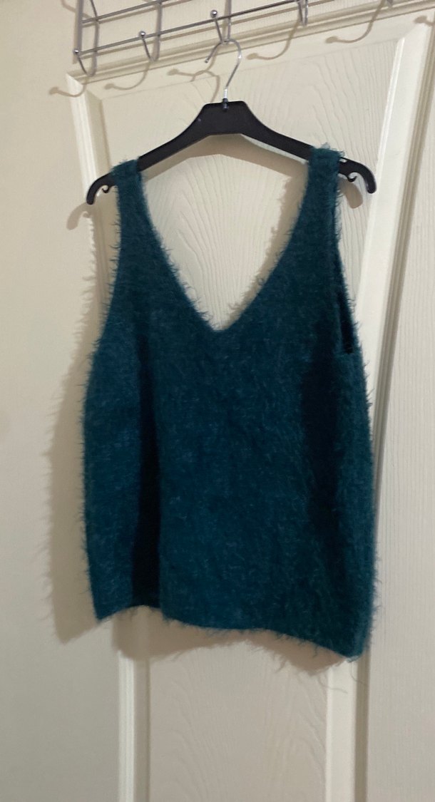 Koyu mavi renkte, V yakalı ve kolsuz örgü mini kazak. Rahat ve bol kesim, günlük sokak stiline uygun.
