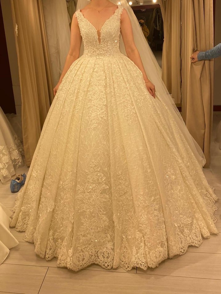 V yaka ve kolsuz, bol kesim beyaz prenses gelinlik. İnce dantel kumaş ile klasik ve şık bir görünüm sunar.