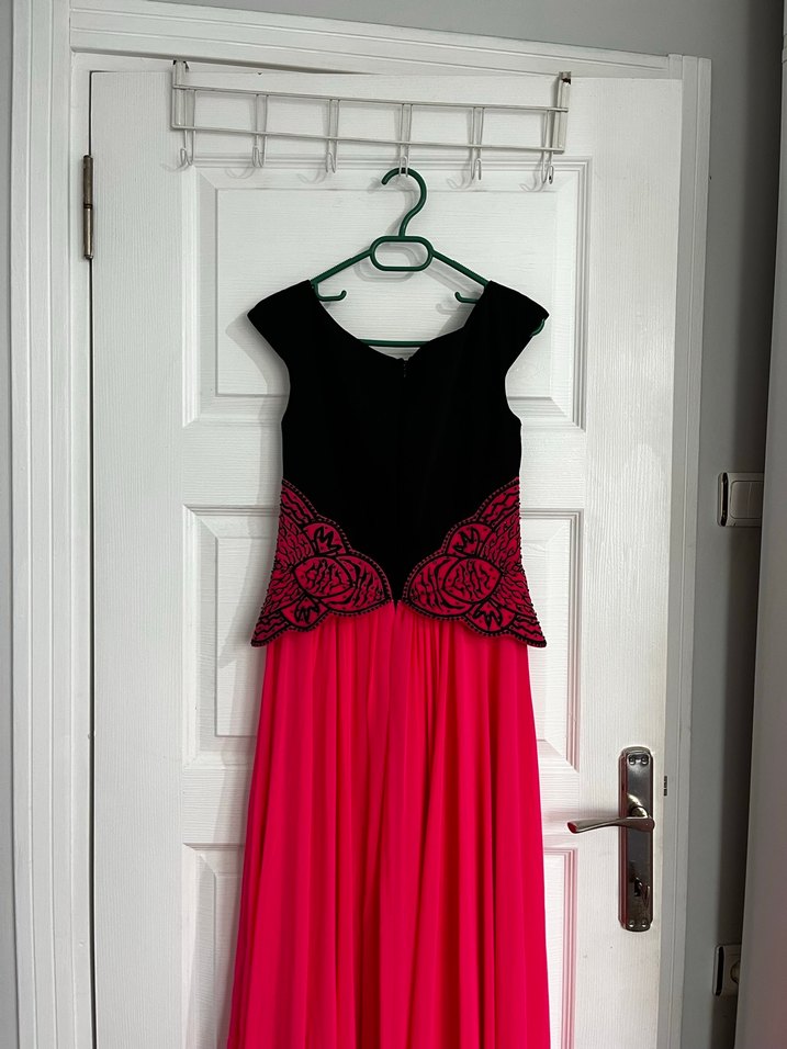 V yaka ve kolsuz, drapeli detaylara sahip dar kesim gece elbisesi. Siyah ve pembe baskılı,mezuniyet parti için uygun,pembe kısım şifondur sadece nişanda bir kere giyilmiştir.