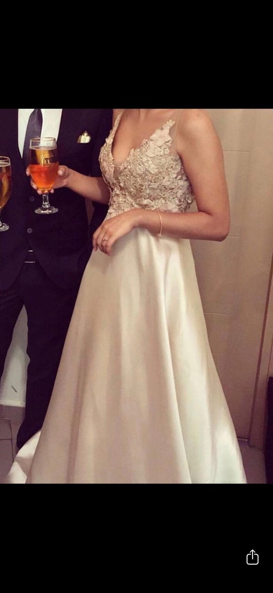 Uzun, A kesim gelinlik; V yakalı, kolsuz ve çiçek işlemeli dantelli gövdeye sahiptir. Gold etek ise düz ve akışkandır. Modern klasik şıklık sunar.