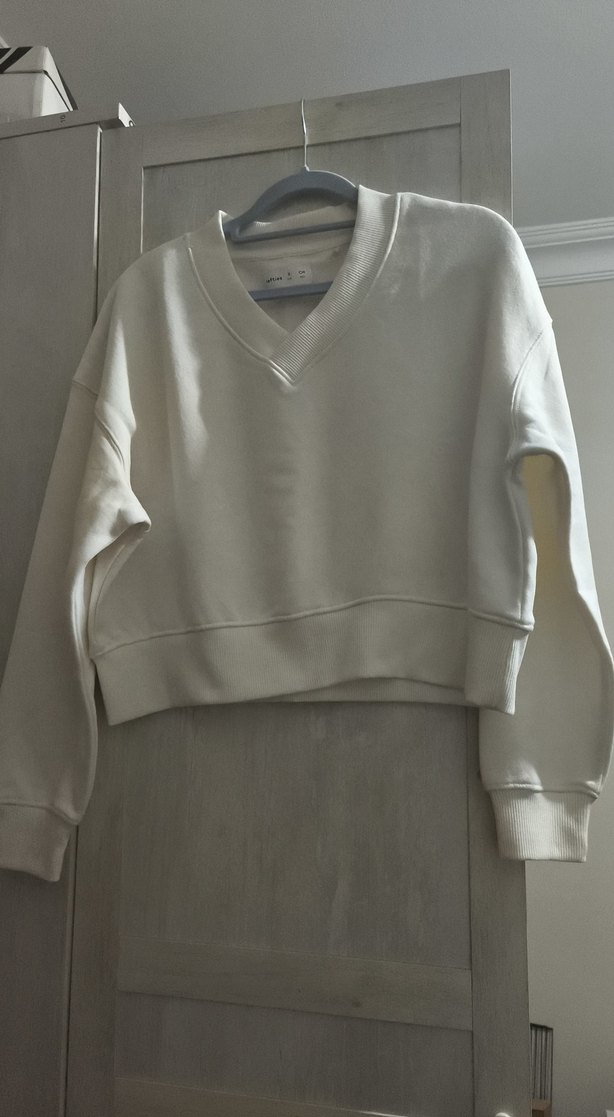 V yakalı, uzun kollu ve bol kesim krık beyaz crop kadın sweatshirt. Yumuşak ve sıcak kumaşıyla günlük kullanıma uygundur, rahat ve şık bir görünüm sunar.