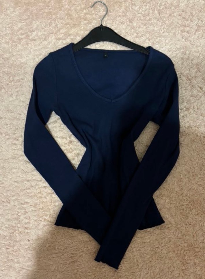 V yakalı, uzun kollu, lacivert kadın triko. Yumuşak sentetik kumaştan, günlük kullanım için rahat ve şık bir sokak stili sunar.