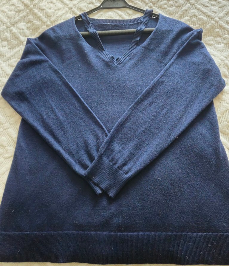 Lacivert renkte, yumuşak yün kumaştan örülmüş, V yakalı ve uzun kollu, bol kesim rahat bir triko kazak. Günlük kullanım için uygundur. çok çok az kullanılmış