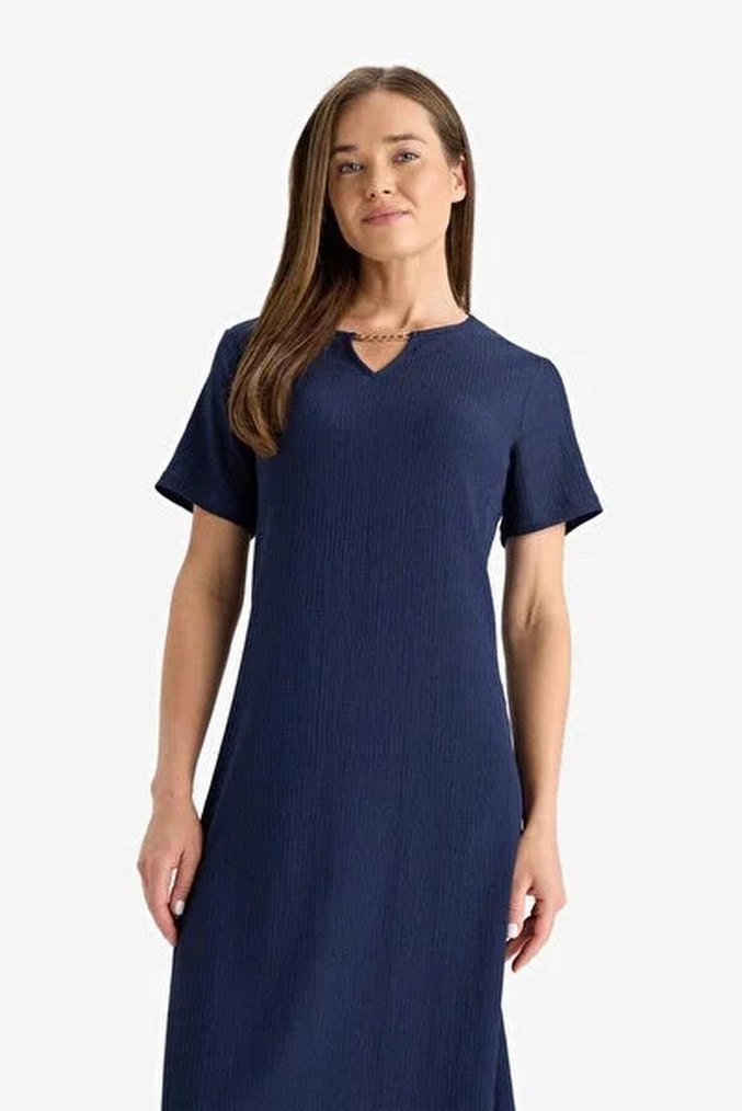 V yakalı, kısa kollu, pilili ve normal kesim lacivert midi elbise. Parlak sentetik kumaştan, ofis için uygundur.