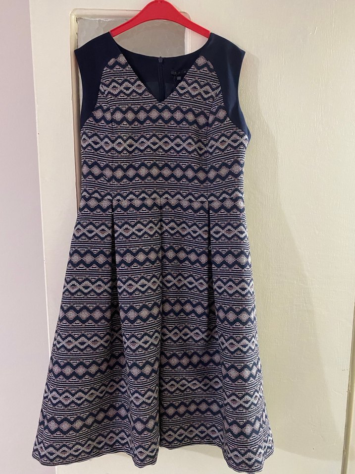 V yaka, kolsuz lacivert ve gri tonlarda elbisesi. Düzenli kesim ve pile detaylı, ofis için bohem tarzda.