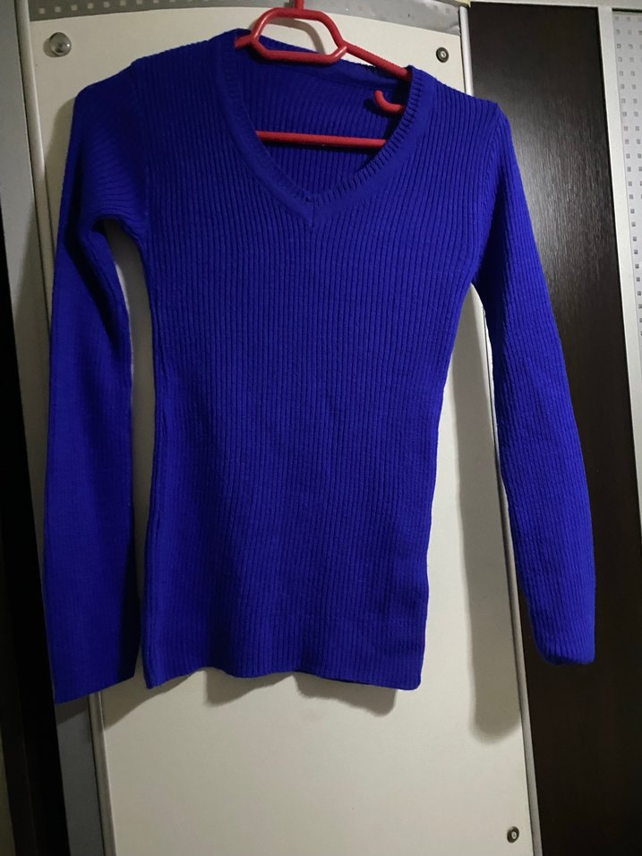 V yaka ve uzun kollu, fitted kesim lacivert örgü kazak. Günlük kullanım için uygun, desen içermeyen rahat sokak stili parçası.