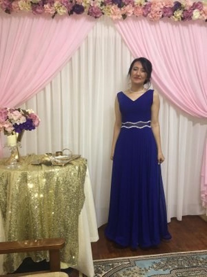 Lacivert uzun gece elbisesi, V yakalı ve drapeli, vücuda oturan kesimlidir. Kolsuzdur ve düğün gibi şık davetler için klasik zarafet sunar. ürün omuzdan boyu 135 cm.