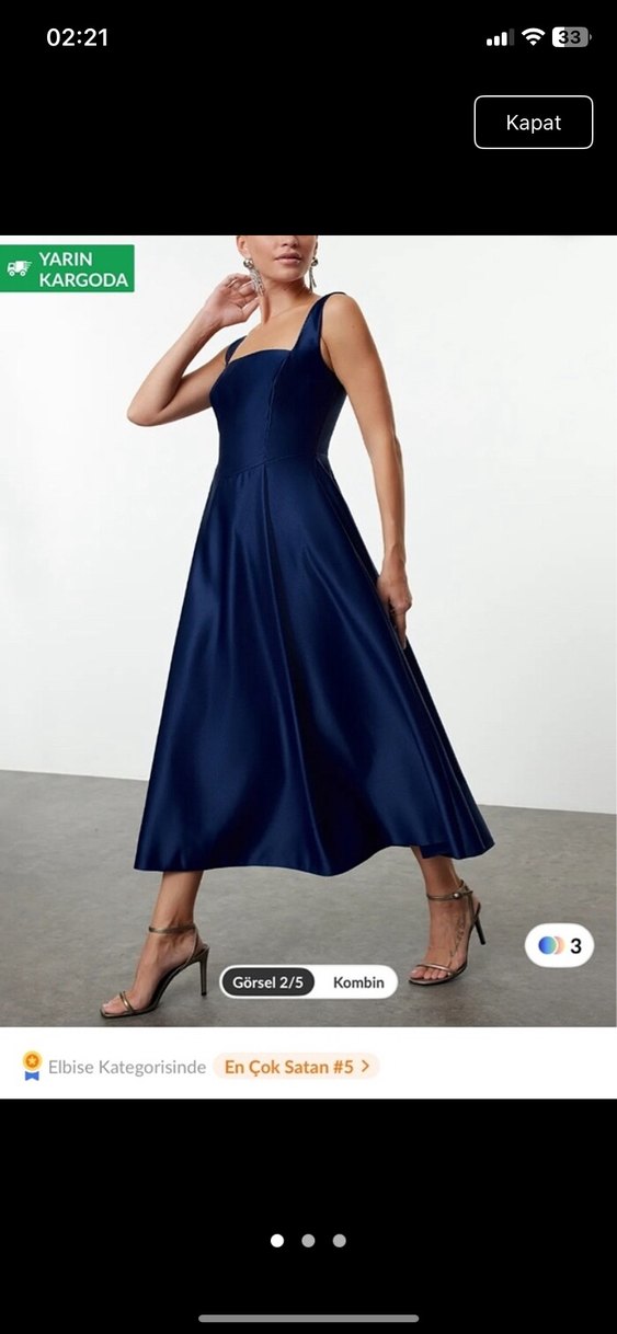Lacivert uzun elbise, V yaka ve askılı kollara sahip. Drapeli, parlak, ipeksi kumaştan, klasik ve modern bir şıklık sunar.