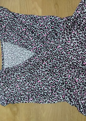 V yaka, fırfırlı ve koyu çok renkli leopar desenli, bol kesim bluz. Yumuşak sentetik kumaştan, günlük kullanıma uygun.