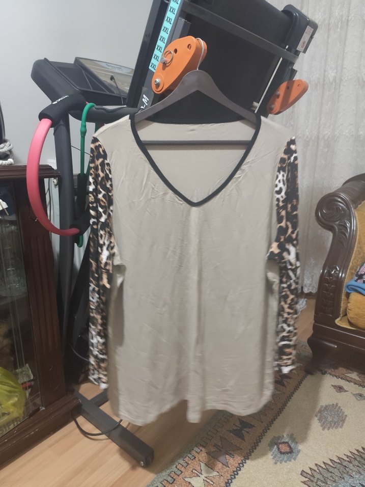 Uzun kollu, V yakalı, bol kesim bej renkli anne bluzu, leopar desenli kollarıyla rahat ve şık bir görünüm sunar.