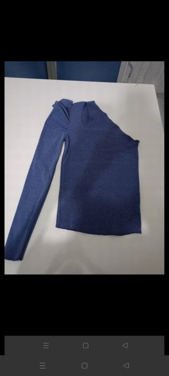 V yaka ve uzun kollu, lila denim kumaştan yapılmış, vücuda oturan kadın kazak. Yırtmaç detayı ve midi boyda, rahat ve günlük kullanıma uygun bir tasarım.