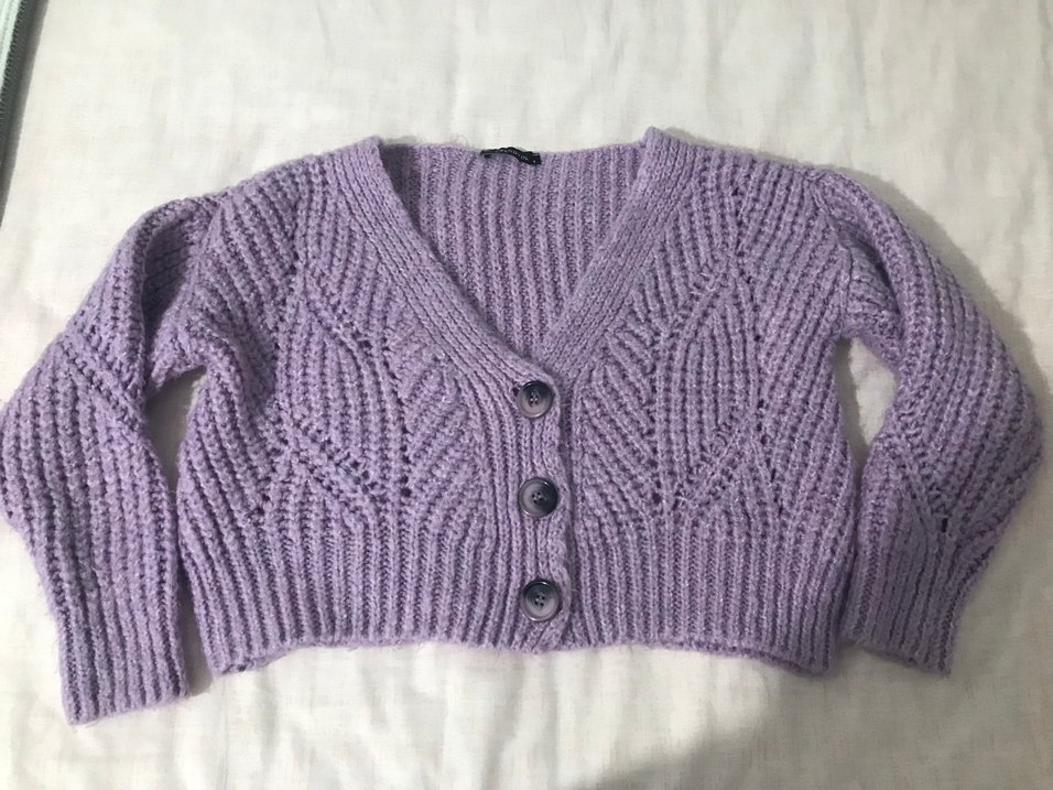 lila örgü crop hırka xs ve s bedene olur.Sadece birkaç kere giydim.