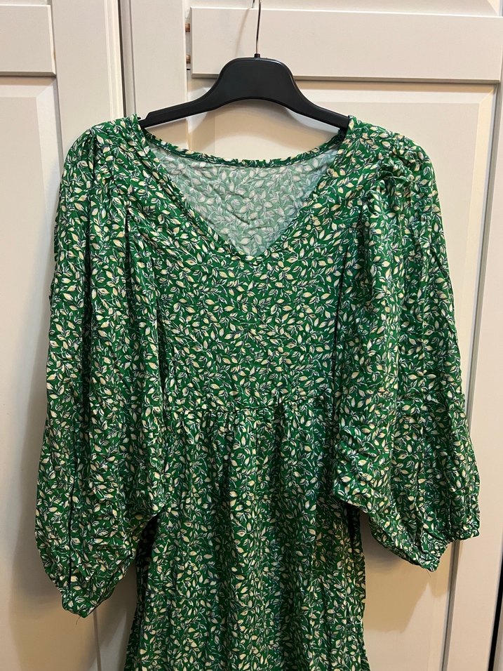 v yaka limon desenli uzun elbise