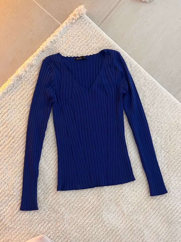 Uzun kollu, V yakalı,mavi body. Sade ve desensiz yapısıyla rahat ve normcore tarzda, günlük kullanıma uygun.