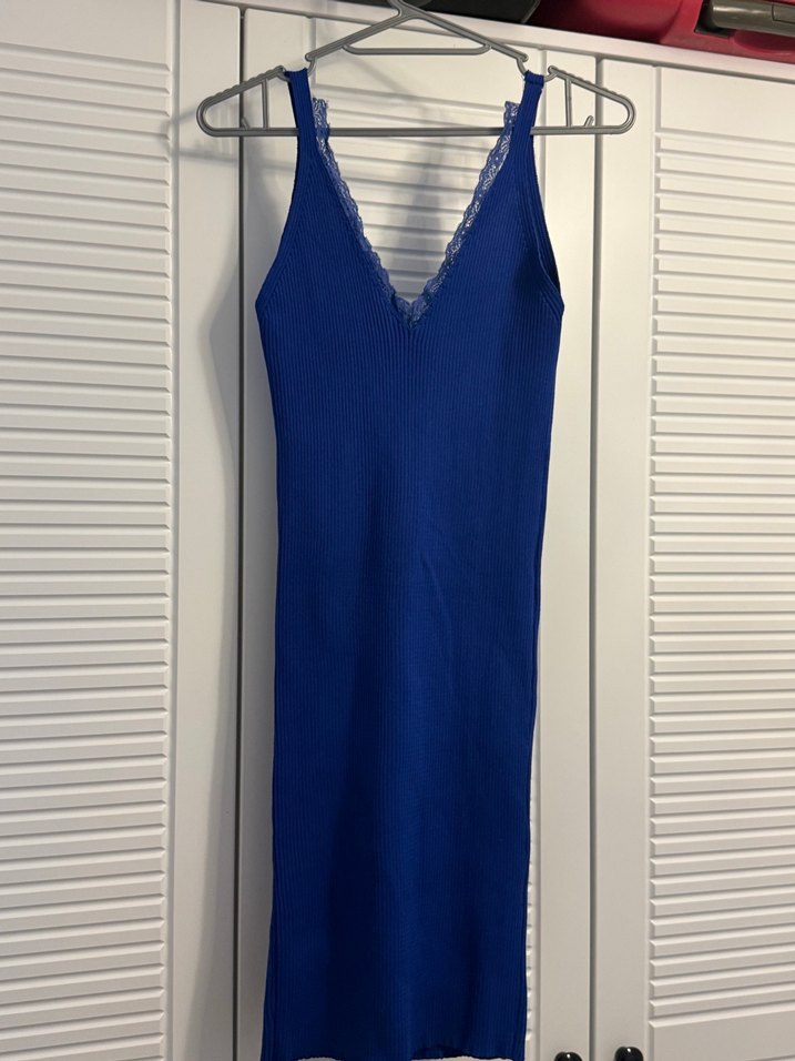 V Yaka Mavi Dantelli Mini Elbise