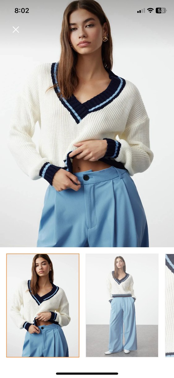 V yaka ve uzun kollu, mavi detaylı yumuşak örgü kadındır. Salaş kesim ve normal boydadır, gündelik rahat stil için uygundur.