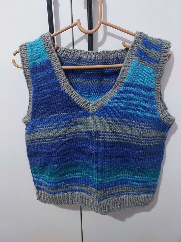 V yaka, örgü kumaştan, mavi ve gri tonlarda, salaş kesim, kolsuz süveter. 38/m bedene uygundur kendim ördüm.