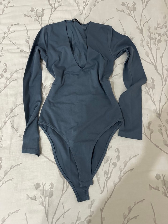V yaka, uzun kollu, mavi renkte, vücuda oturan kadın bluz. Midi boy ve desensiz, günlük kullanıma uygun cesur bir sokak stili sunar.