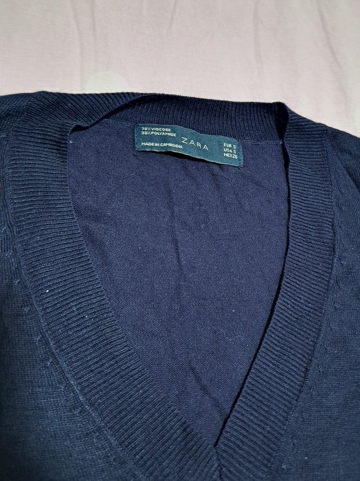 Mavi kumaştan, V yakalı kadın kazak. Uzun kollu, normal kesim, günlük rahat kullanıma uygundur.