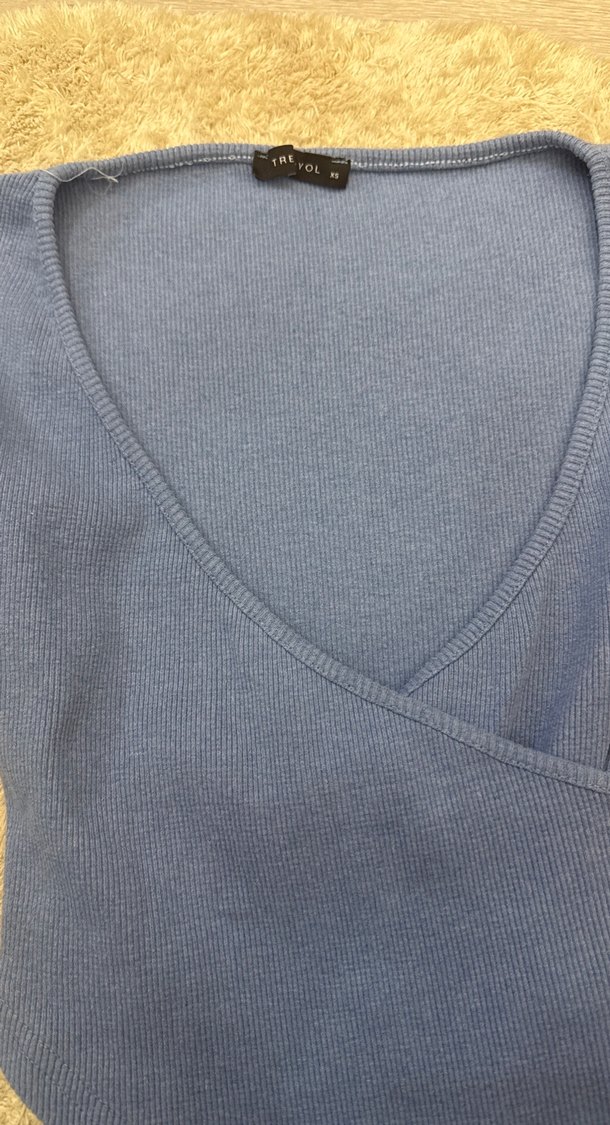 Mavi tonlarında, V yakalı, uzun kollu ve pamuklu örme dokulu kadın kazak. Rahat ve gündelik kullanıma uygun, normcore tarzda.