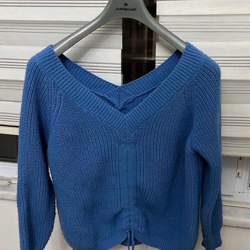 Mavi örgü kadın kazak, V yaka ve uzun kollu, vücuda oturan kesimiyle günlük kullanıma uygun rahat bir stildir.
