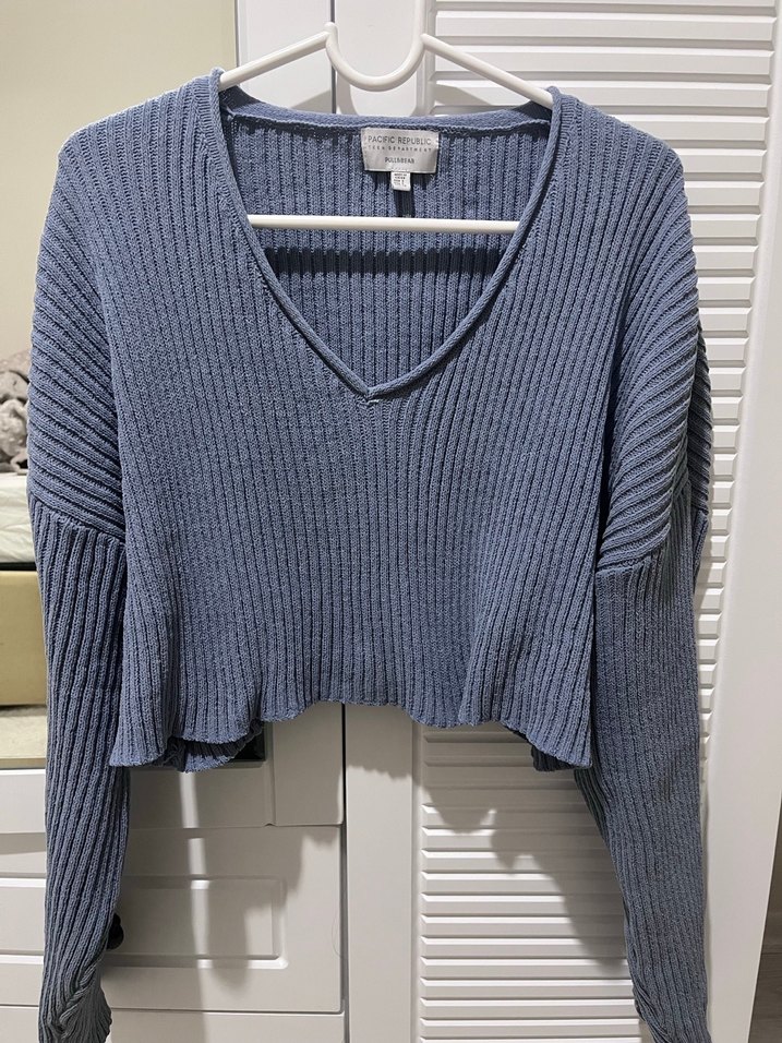 Bu mavi örgü kazak, V yaka ve uzun kollu, bol kesim özellikleriyle rahat bir görünüm sunar. Normal midi boyda ve desensizdir.
