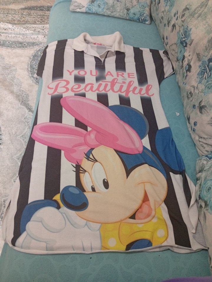 , kısa kollu ve V yakalıdır. Sentetik kumaştan, pastel renklerde baskılı ve fırfır detaylıdır. Üzerinde 'Beautiful' yazısı bulunur.