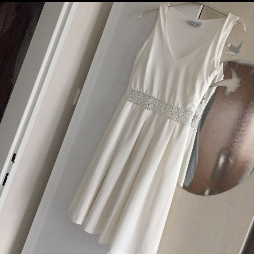 V yakalı, kolsuz beyaz midi elbise Bol kesim ve belde süslü detay bulunur, klasik zarafet ile bohem tarzı birleştirir. Düğünler için uygun.