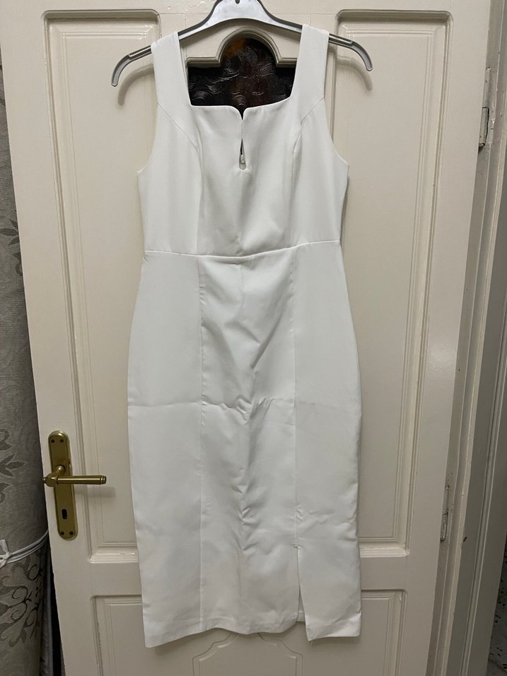 V yaka, kolsuz beyaz midi elbise, ön fermuarlı ve normal kesim. Ofis ve sokak modasına uygun şık bir parça. ️