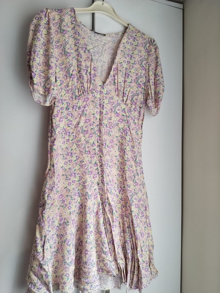 V yaka, kısa kollu, midi elbise. Pastel pembe tonlarında, yumuşak sentetik kumaştan, günlük kullanıma uygun.