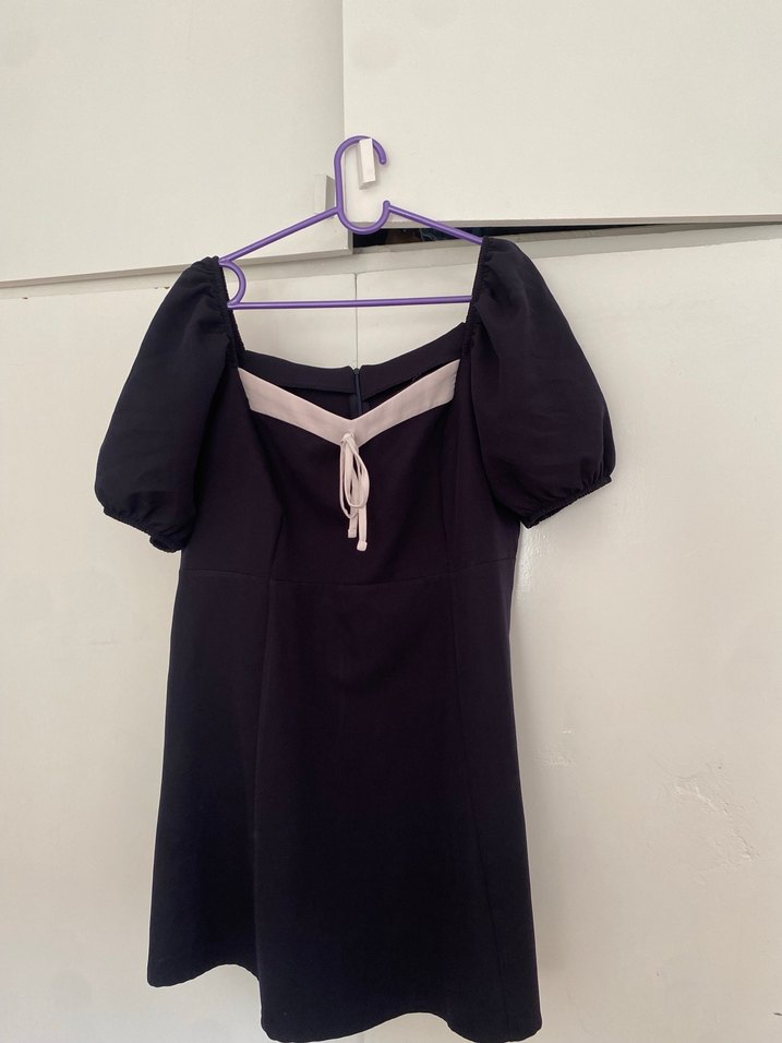 V yaka ve balon kollu, dar kesim midi elbise. Sentetik kumaştan, koyu renkte ve bağcıklı detaylı.