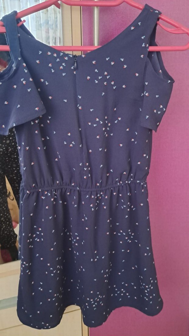 V yaka, kısa kollu ve fırfır detaylı bu midi elbise, sentetik kumaştan yapılmıştır. lacivert desenli ve ince kesimdir, 12 yaş için uygundur