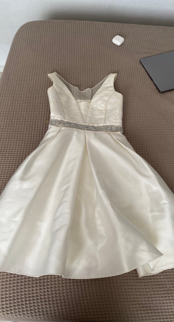 V yakalı, kolsuz, beyaz mini çocuk abiye. Parlak kumaş ve belde süslemeyle modern klasik tarzda, midi boy etek. Sadece 1 kere kullanıldı