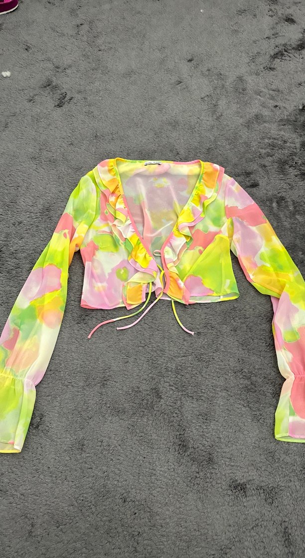 Bu kadın bluzu, uzun kollu ve V yaka olup, fırfır detaylarıyla dikkat çeker. Pastel renkli tie-dye deseni ve kısa kesimiyle, yumuşak sentetik kumaştan üretilmiştir.