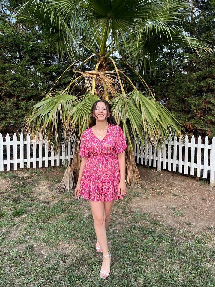 Pembe tie-dye desenli, V yakalı ve kısa kollu, rahat kesim mini elbise. Yumuşak sentetik kumaştan, dantel detaylı, açık hava kullanımı için uygun.