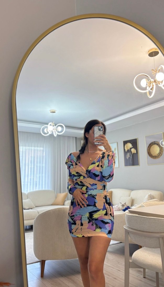 Pastel renklerde, transparan uzun kollu, V yakalı, mini boy, vücuda oturan bağlama desenli elbise. Cesur ve çağdaş tarzda günlük kullanıma uygun.