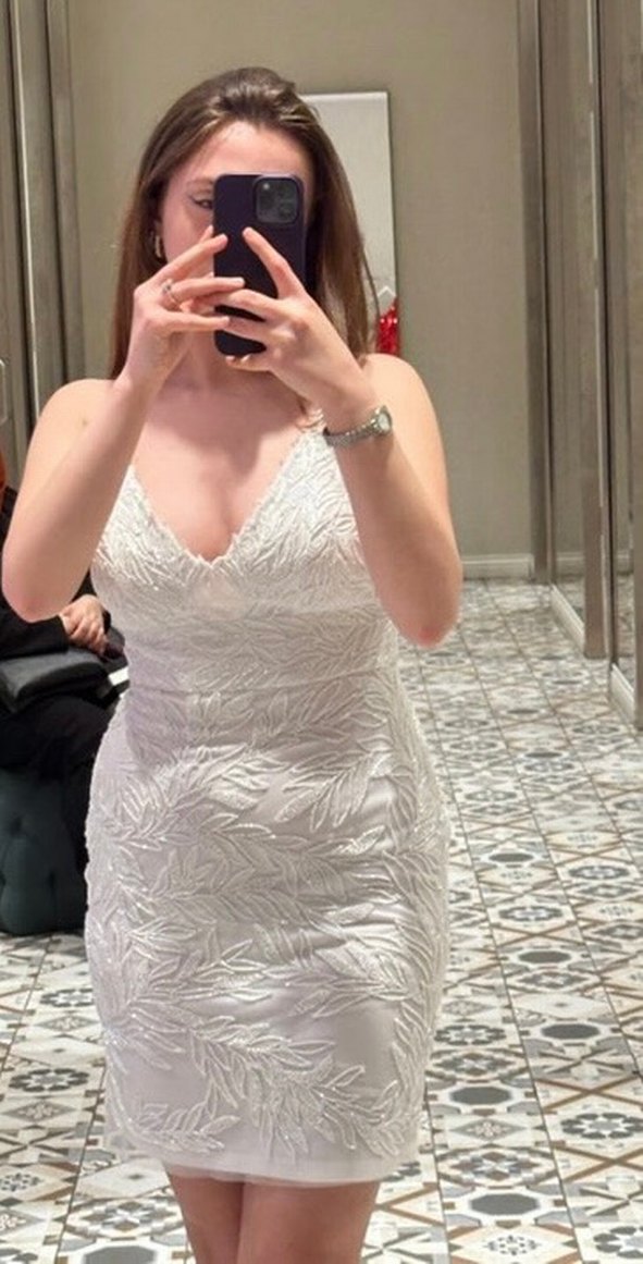 V yakalı, ince askılı beyaz taş işlemeli özel dikim elbise sadece bir kez giyildi alış fiyatı 13.499 tl