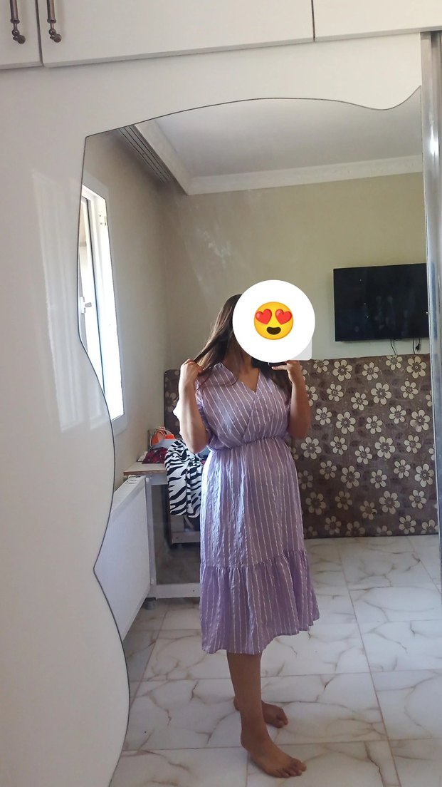 Mor tonlarında, uzun kesim ve bol fitli V yaka ve bağcıklı kol detayları bulunur. Hafif saydam, bağlama desenli, sentetik yumuşak kumaştan yapılmıştır. Parti için uygundur.