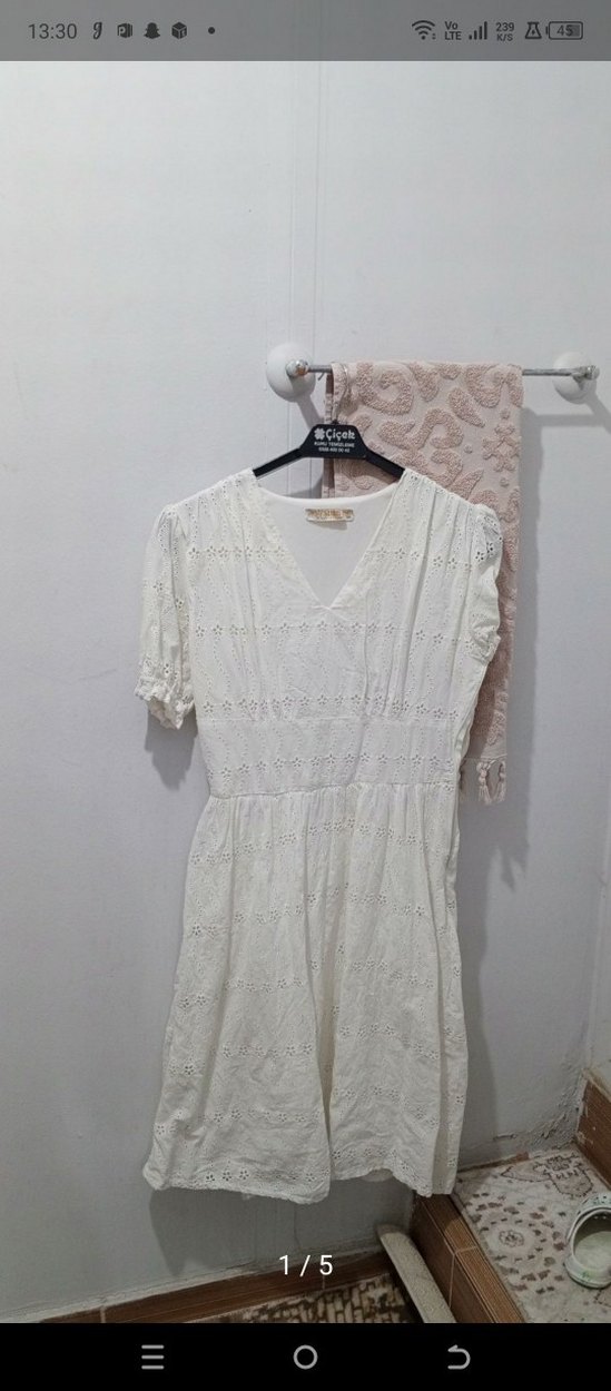 Yumuşak pamuktan, V yakalı ve kısa kollu, nakışlı dantel detaylı, bol kesim beyaz bohem midi elbise. herhangi bir kusuru Yoktur zaten hediye gelmişti denedim bana olmadı Ondan sonra da hiç giyilmedi